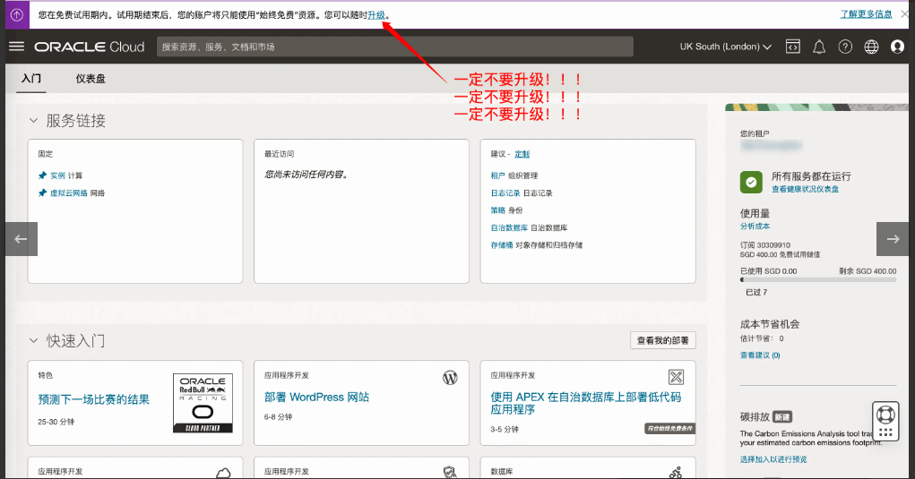 注册成功后,一定不要点【升级】,要选择【符合始终免费条件】的配置,这样无论怎么使用,信用卡都不会扣费;
