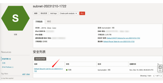 进到“实例详情信息” -> 子网,点击对应的“安全列表”